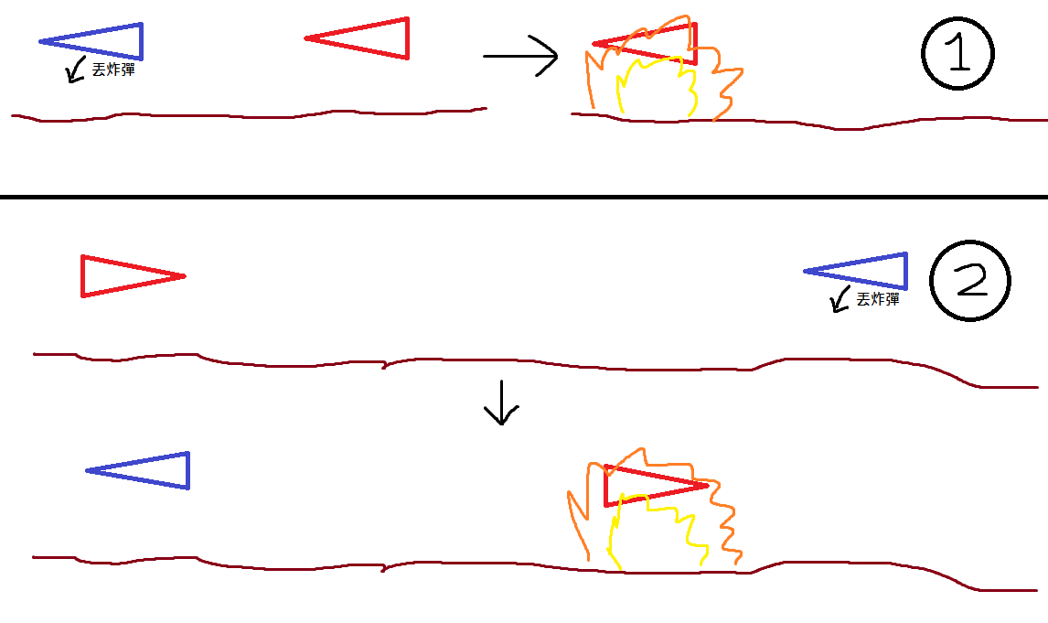 圖中有 2 種情況, 以 1 最常見 (被炸死的大多也是這樣) 你被人追, 貼近地面飛行, 只要對方不是太遠或是快將爬你頭就可以丟了, 有時攻擊地面目標也有可能不小心(?) 將後面追殺你的傢伙炸死