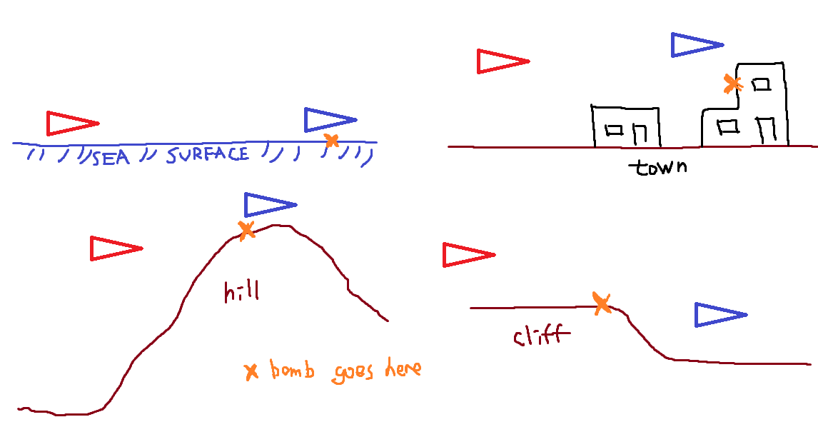 2 是狗戰時用的 首先肯定敵方會和你在地面附近交戰, 和 (1) 不同的是因為這時雙方是迎面的, 要預更多距離, 早一點丟, 至於要預多少時間/距離就看經驗了, 平時丟地面目標多也大概估到丟彈後多久才爆