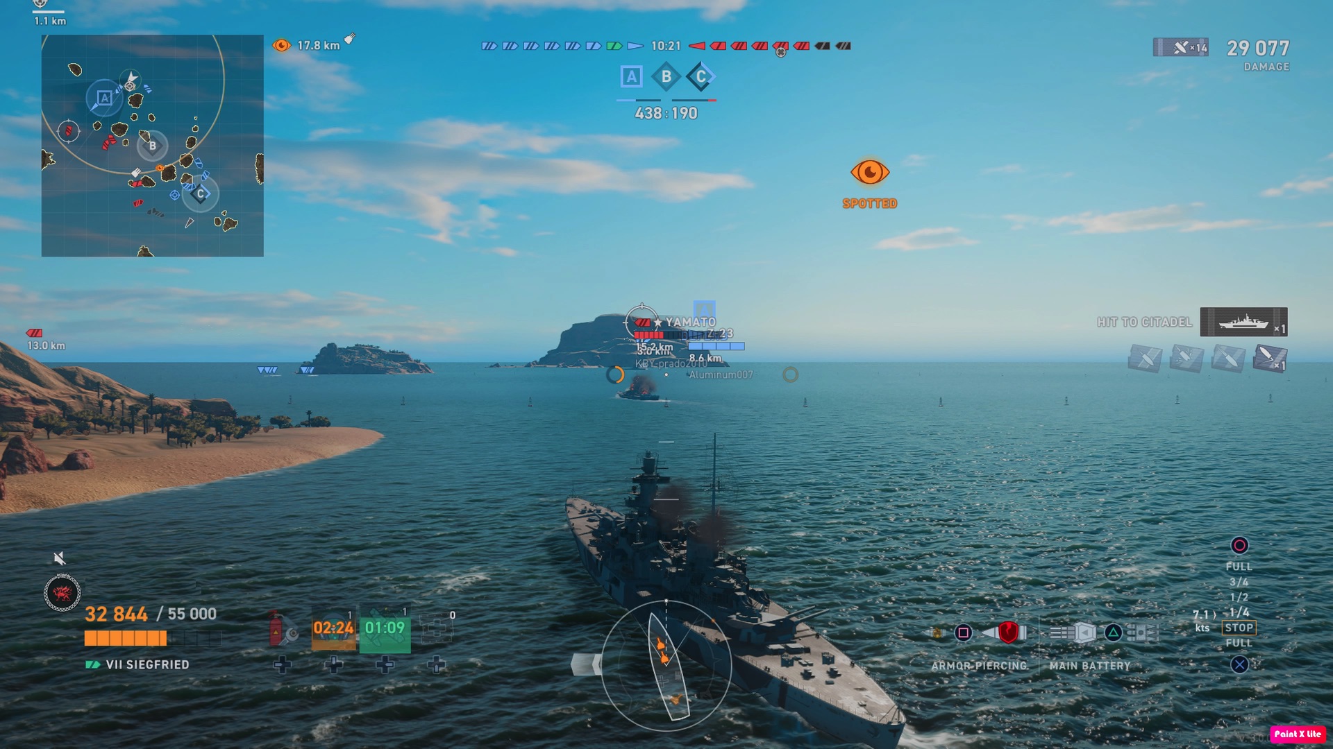 這個月剛好有齊格飛的活動,pc版是9階,家機版是7階,跟天城IOWA俾斯麥在同一階,看了一下pc版的評價好像很不錯,所以我就入手了,我讓巡洋艦技能特化的卡爾·馮·穆勒當艦長,技能都拿去強化加長射程,ap穿透力&傷害,第一場就被拉上頂階場對上大和和大猴,我的天,艦長強化過後的齊格飛射程跟大和同等級,連一票16吋/410mm大根都輸它,其主砲的散步跟pc版的北宅主砲不同,實在是有夠準,顛覆我對38cm連裝砲的壞印像,強化過的ap彈遠距離要給大和&大猴半傷輕輕鬆鬆,很少跳彈,而其本業-獵殺巡洋艦,幹起來更是簡單,大和級的射程+巡洋艦的隱蔽,遇到不長眼不擺角的ca/cl,一炮齊射過去對方半條血就沒了...