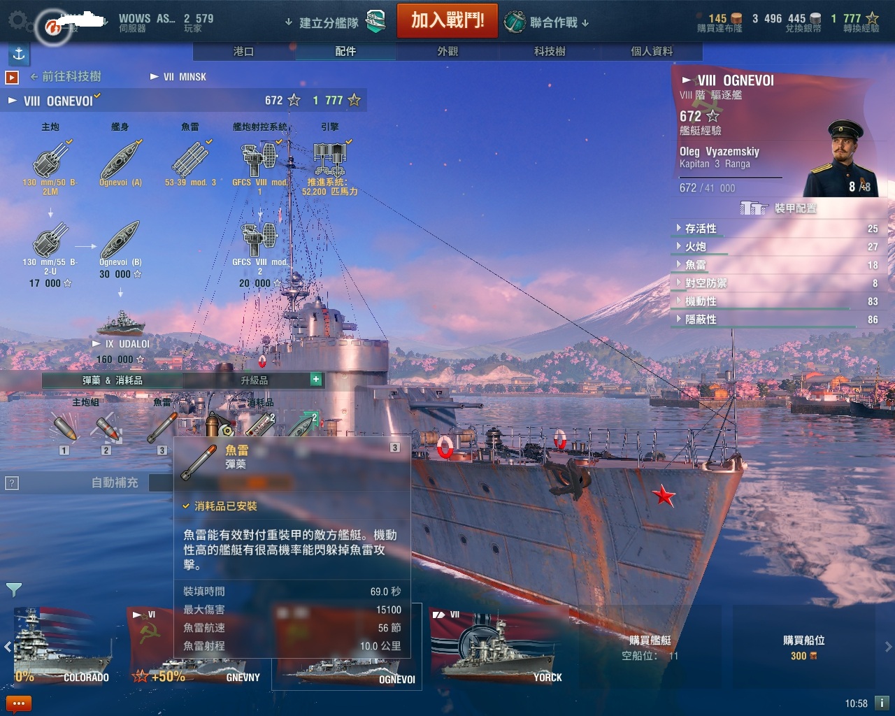 無名氏: 塔什干的頂魚雷裝填時間69秒 技能加配件的話可以押到54秒左右 (WnIyaEiI 17/03/07 20:40)